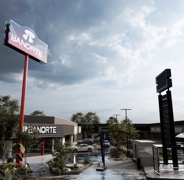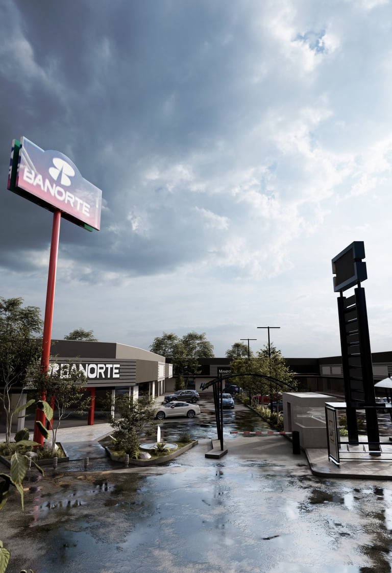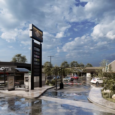 Esta propuesta de infraestructura comercial se articula mediante una estética de pragmatismo industrial y una configuración de nodos de conectividad que jerarquizan la experiencia del usuario en movimiento. El proyecto prioriza una comunicación visual de alto impacto, donde la señalética vertical de gran escala funciona como un eje ordenador del espacio y un hito de referencia urbana. A través de un manejo de materialidad reflectante y una gestión técnica de pavimentos de alta resistencia, logramos una síntesis entre la durabilidad operativa y la eficiencia programática que define el rigor constructivo de nuestra firma.
