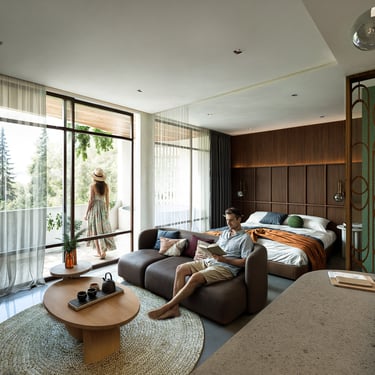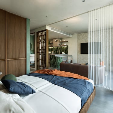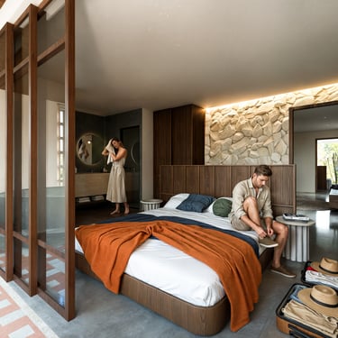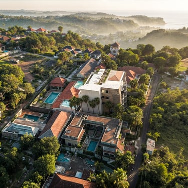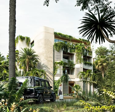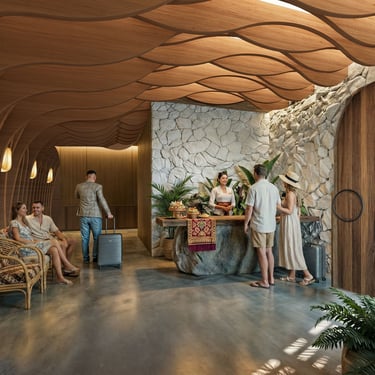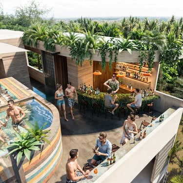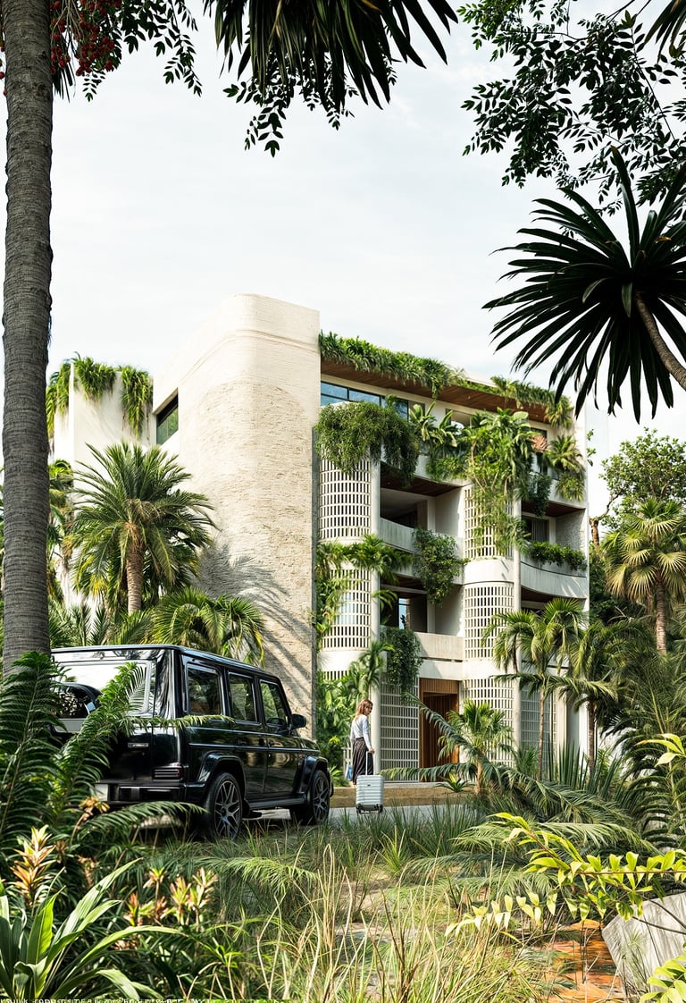 Enclavado en el corazón de la selva balinesa, este proyecto hotelero se erige como un santuario de arquitectura orgánica, donde los volúmenes curvos y las texturas artesanales dialogan armoniosamente con la exuberancia del paisaje indonesio. La fachada se distingue por el uso de celosías y mampostería texturizada que no solo aportan carácter estético, sino que permiten una ventilación cruzada constante, filtrando la luz tropical de manera poética. El diseño biofílico integra jardines colgantes que desbordan desde cada nivel, fusionando la estructura con la vegetación circundante para ofrecer una experiencia de lujo inmersivo y serenidad vernácula.